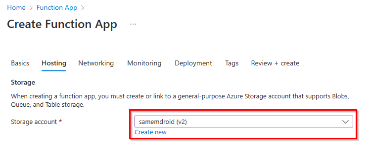 - Next, on the Hosting tab, select your preferred storage account or create a new one.