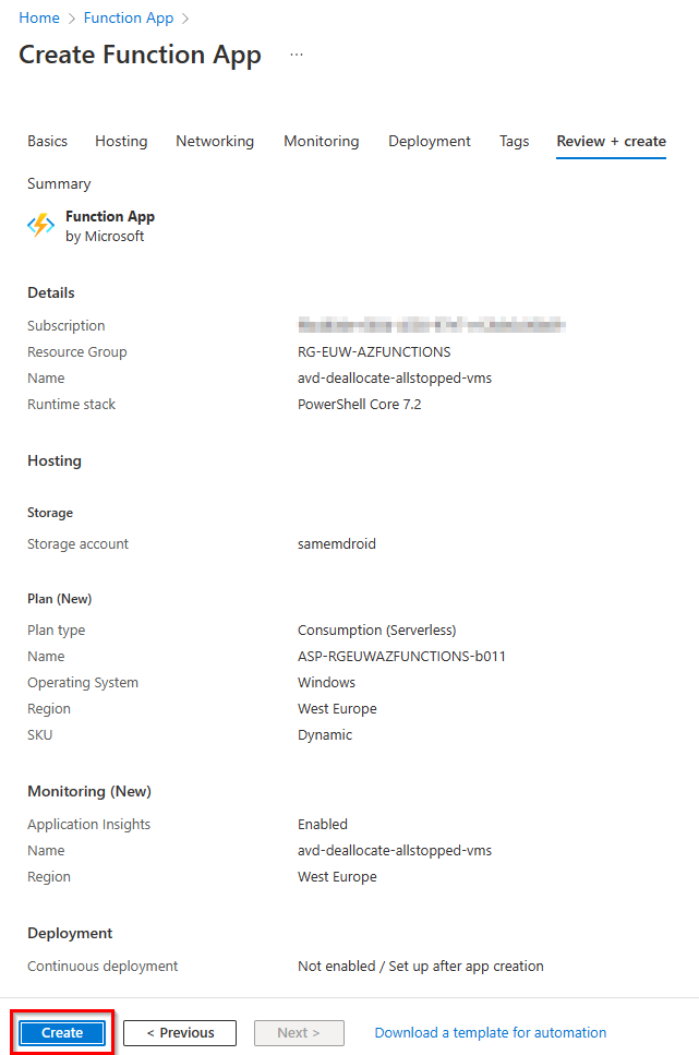 - Select your project details (subscription/resource group) and then select a unique Azure function name, select PowerShell Core as runtime stack and your preferred region. For the operating system, select Windows and the plan type should be Consumption (Serverless).