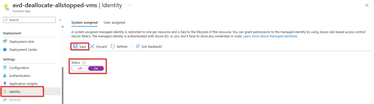 - When the Azure function is successfully created, access the resource. First, you need to enable a system-assigned managed identity and assign an Azure permission role that enables virtual machine shutdown. Open Identity Settings and change the status for the assigned system from Off to On, and then click Save.