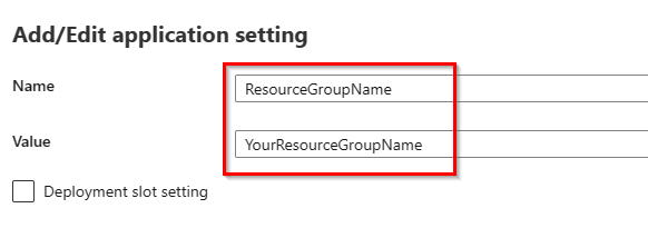 Click New Application Setting and enter ResourceGroupName as the application setting name and your value, which should be the resource group where your personal AVD session hosts are stored.