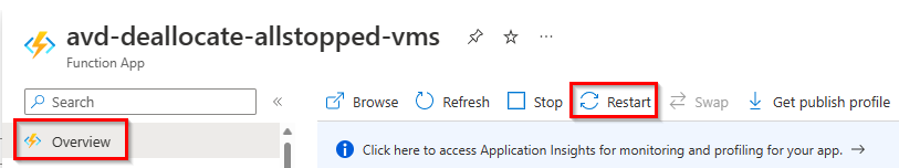 - After you change the app file for the PowerShell modules, you need to restart the entire Azure function. To do this, select Overview and click Restart.