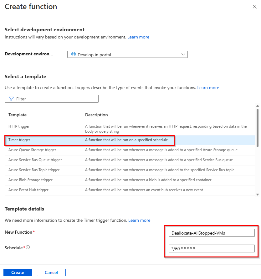 - Now you need to create a function as a timer trigger so that the function is automatically executed every minute or every 5 minutes or whatever. Within your Azure functions, navigate to Function, then click Create and select Timer Trigger. Then enter a descriptive name for this function and the schedule, e.g. “/60 ” for each minute.
