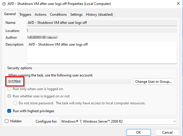 First, let’s show what the scheduled task looks like, but you will need to implement the scheduled task as part of your imaging or provisioning process for new AVD session hosts. Below we have added the PowerShell commands to create this task automatically.