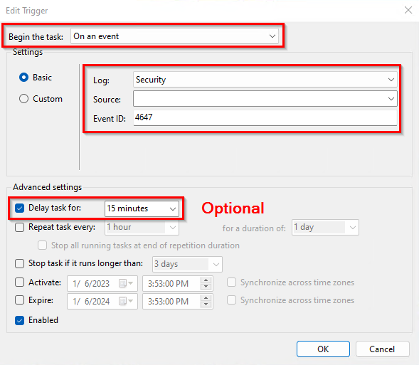 As a trigger, you must select On Event and then Security as Protocol and 4647 as Event ID, which means that this task will be taken when this specific Event ID occurs.