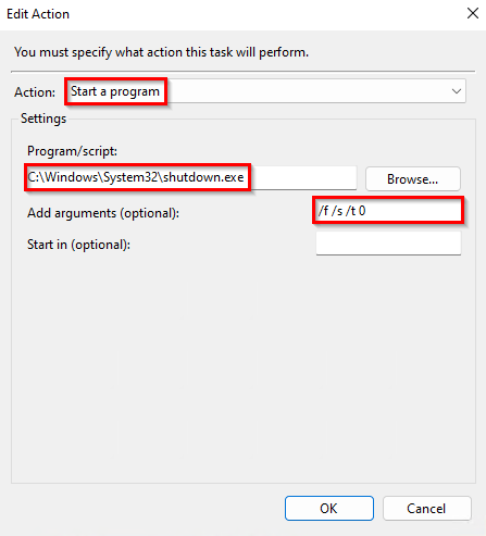 Next you need to define the action and select Start programme, enter the path of shutdown.exe (C:WindowsSystem32shutdown.exe) and add the arguments /f /s /t 0.